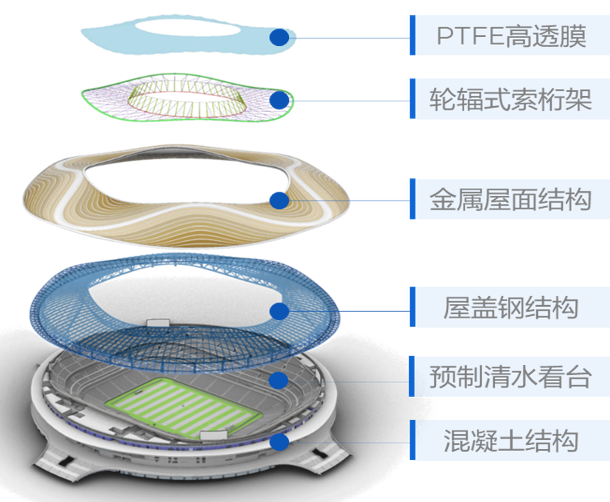 項目屋蓋結構由鋼結構索膜結構和金屬屋面組成,形成平面投影為中央開孔直徑約280米的“鋼鐵圓環”,屋頂沿環向呈波浪起伏狀,是國內首例專業足球場大規模應用高透光率PTFE網格膜材料。