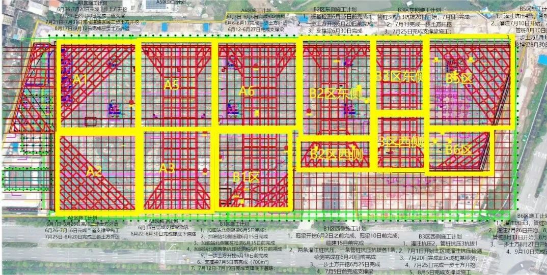“網(wǎng)格化”也能破解安全管理難題,項目軟弱土層平均厚度22.9m、基坑深11m,地下水位較高,基坑安全管理難度較大。項目將基坑分為多個“網(wǎng)格”開挖,結(jié)合“網(wǎng)格”特點調(diào)整出土通道,對存在特殊危險點的“網(wǎng)格”增設(shè)監(jiān)測點,通過數(shù)據(jù)分析制定針對性舉措,保障基坑施工安全運行。