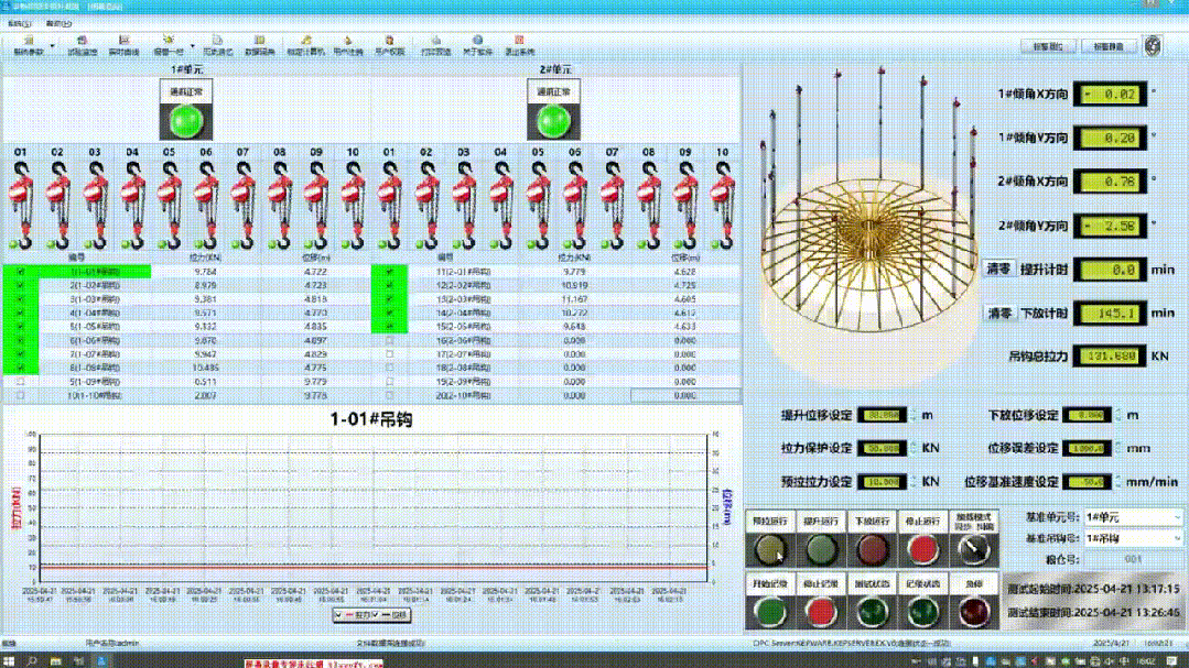 研發位-力混合控制算法,采用PID閉環控制與模糊自適應模型動態調節頂升速度,確保施力均衡整合傾角、位移等數據構建三維模型,直觀展示升降過程各項數據,通過控制柜與中控雙通道交互,讓施工人員可實時查看數據接收預警并及時進行干預。