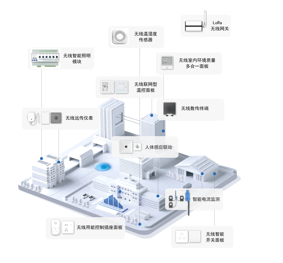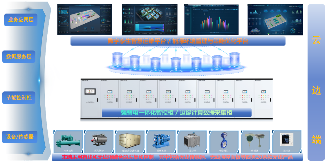 云層作為一體化架構的“智慧大腦”,集成了數字孿生智慧綜合運維平臺與能源環境管理與策略優化平臺兩大核心平臺,綜合運維平臺以數據為基礎,構建出建筑的數字畫像,實現暖通、照明、安防等多系統的集成管理,提供智慧高效、低碳節能的場景應用;邊緣層由強弱電一體化智控柜與邊緣計算數據采集柜組成,它們如同“神經網絡”,負責就地控制、遠程監控及數據處理,強弱電一體化智控柜將強電控制與智能化自控完美融合,實現設備的集中管理與能效優化;終端層由無線低功耗傳感器、無線聯網型溫控器、無線智能照明系統及無線遠傳儀表等四類20余款產品構成,它們如同“感官器官”廣泛分布于建筑各處,實時感知環境變化。
