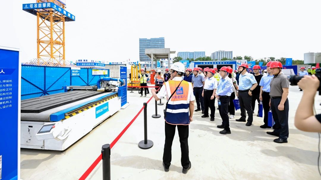 期間,與會(huì)人員共同觀摩項(xiàng)目智慧建造展廳,對(duì)中建八局一公司抹灰機(jī)器人、便攜式管道焊接機(jī)器人、全自動(dòng)智能套絲機(jī)器人、四輪激光地面整平機(jī)器人等智慧建造產(chǎn)品予以肯定。