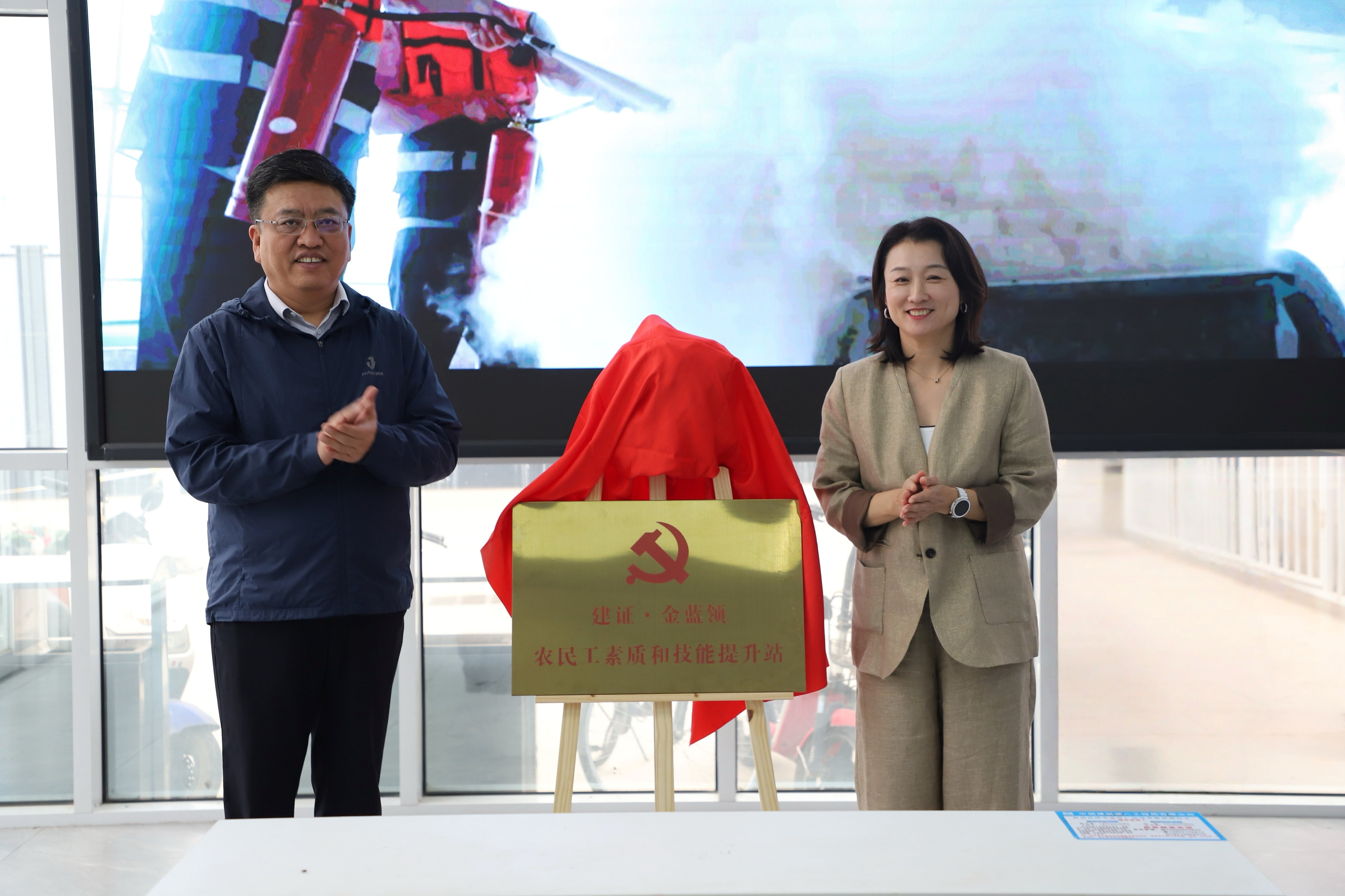 期間,譚博一行參觀了項目綜合展廳、工友綜合服務中心與工友生活區,詳細了解項目建設進展與生活工作條件,對項目工會工作開展情況給予肯定。譚博、聶麗共同為項目“建證·金藍領”農民工素質和技能提升站揭牌。