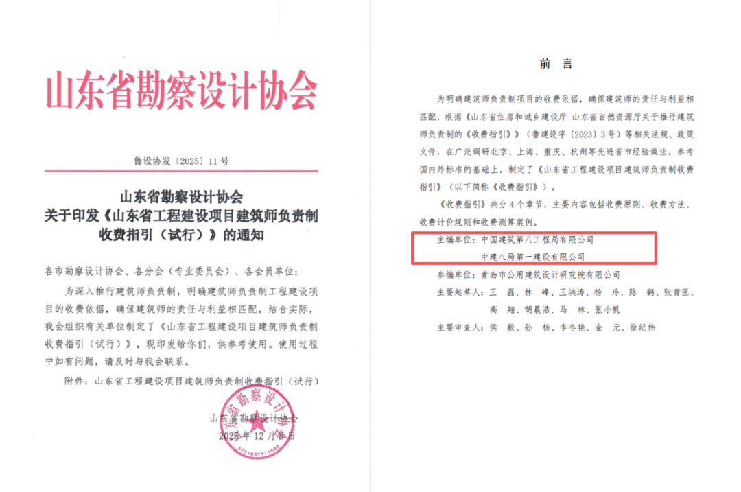 近日,由山東省勘察設計協會印發、中建八局與中建八局一公司主編的《山東省工程建設項目建筑師負責制收費指引(試行)》正式發布,為市場定價與合同簽訂提供明確依據,助力工程建設組織模式改革與建筑行業轉型升級。