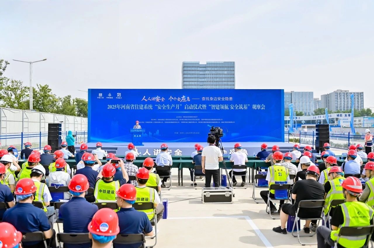 5月30日,由河南省住房和城鄉建設廳主辦,中建八局等單位協辦的2025年河南省住建系統“安全生產月”啟動儀式暨“智建領航 安全筑基”觀摩會在鄭州航空港區“兩院一中心”二期項目舉行,全面掀起“安全生產月”活動熱潮。