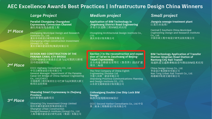 12月25日,2020全球工程建設業卓越BIM大賽最佳應用實踐項目獲獎名單揭曉,京臺高速改擴建項目二標段所提交的項目榮獲基礎設施設計類別中型項目組最佳實踐獎第二名。