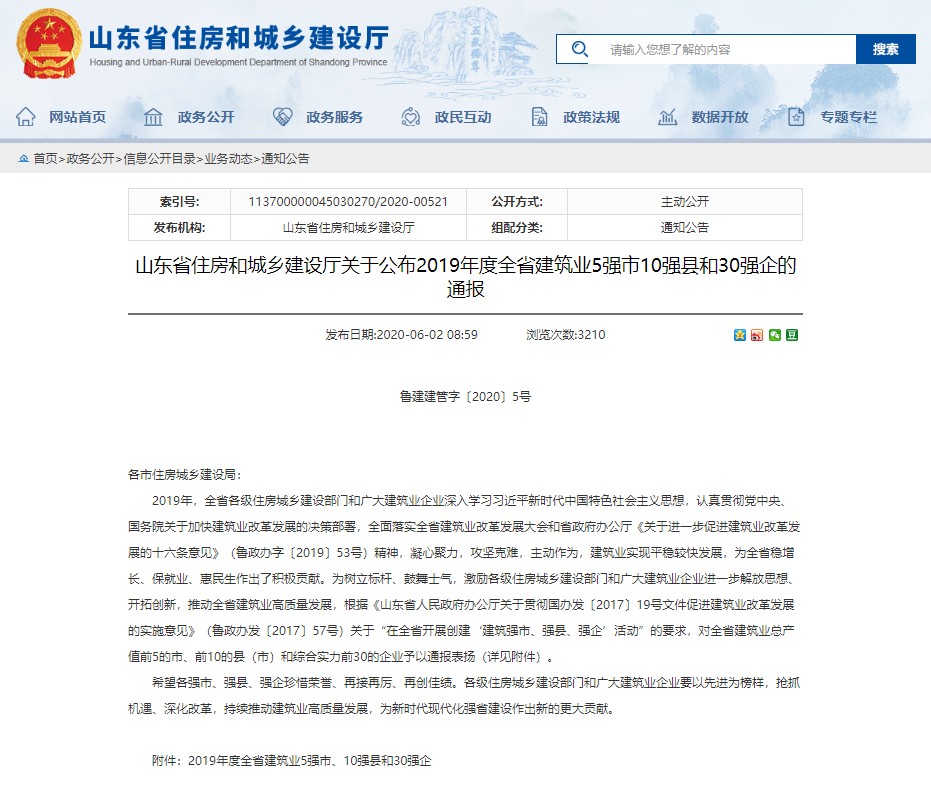 近日,山東省住房和城鄉建設廳發布《關于公布2019年度全省建筑業5強市10強縣和30強企的通報》,中建八局一公司綜合實力連續3年蟬聯山東省建筑企業30強第四名。