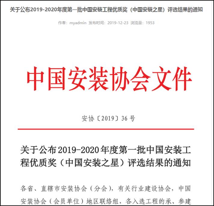 安裝公司兩項工程榮獲中國安裝工程質(zhì)量最高獎“中國安裝之星”