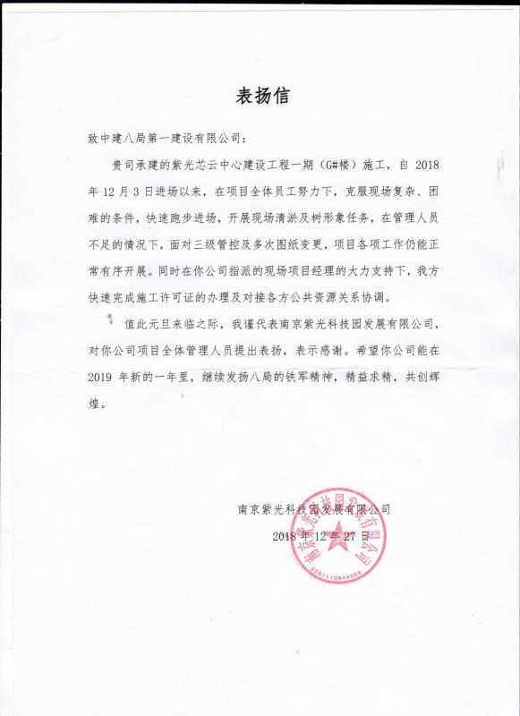 近日,南京紫光芯云中心建設(shè)工程一期G#樓項目,入場短短20天時間,喜獲業(yè)主單位表揚信。
