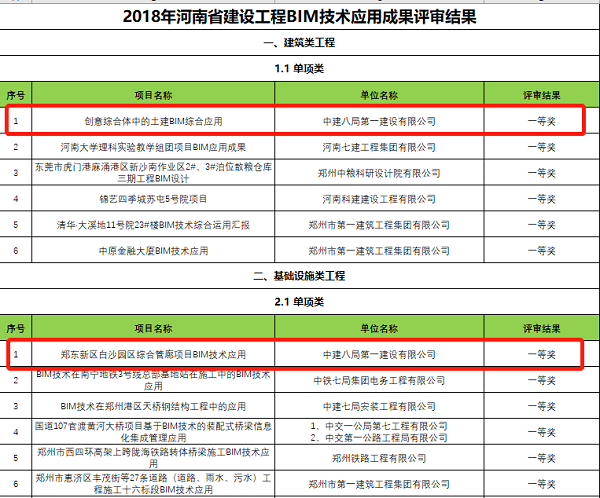 由河南省建筑業(yè)協(xié)會主辦的2018年河南省建設(shè)工程BIM技術(shù)應(yīng)用成果評審結(jié)果出爐,中部國際、白沙管廊項目分獲建筑類工程、基礎(chǔ)設(shè)施類工程單項類一等獎第一名。