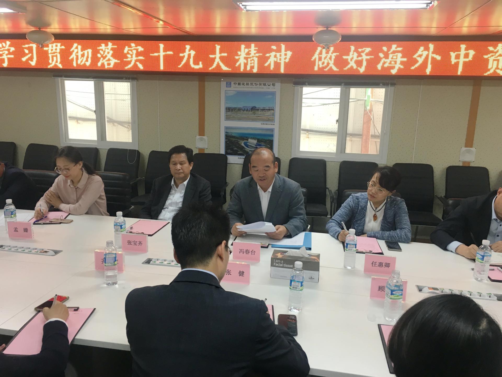 5月21日,中國駐濟州總領館與濟州中國商會黨建工作交流會在由中建八局承建的濟州夢想大廈新建工程項目舉行。 中國駐濟州總領館總領事馮春臺、副總領事張寶齊、領事任惠卿、副領事吳錫路、副領事孟珊一行到會指導,濟州中國商會會長、夢想大廈項目經理張健、綠地總指揮顧霞芳、國航代表齊永軍、東航代表魯韻梓等17位中資企業黨員參加了此次會議。
