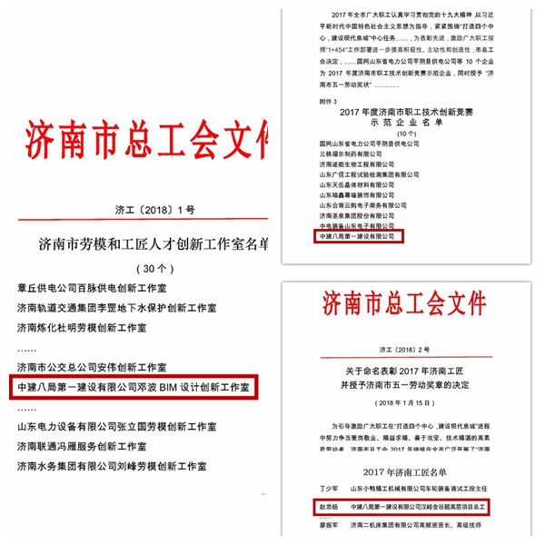 公司榮獲“2017年度濟南市職工技術創新競賽示范企業”、“濟南市五一勞動獎狀”;公司鄧波BIM設計創新工作室榮獲“濟南市勞模和工匠人才創新工作室”榮譽稱號;公司漢峪商務中心A5-3#樓及附屬設施工程項目總工程師趙忠楊榮獲“2017年濟南工匠”、“濟南市五一勞動獎章”榮譽稱號...