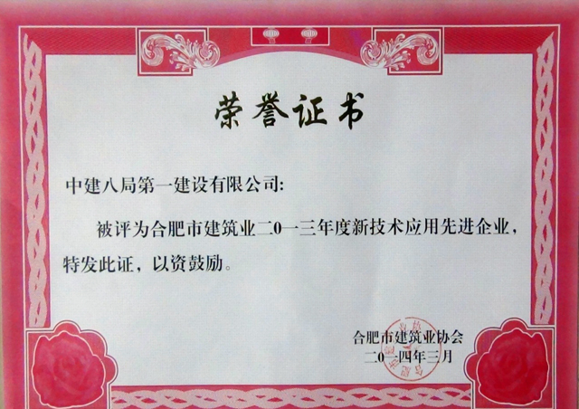 公司榮獲2013年度合肥市建筑業新技術應用先進單位