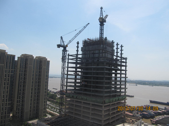 蕪湖僑鴻國際工程結構高度273.15米,建筑高度318米。項目自開工以來,項目部先后完成了大體積混凝土澆筑、超大噸位動臂式內爬塔吊爬升及大跨度支撐鋼梁安裝、大跨度勁性預應力梁施工、超高層混凝土泵送、鋼管柱高拋自密實混凝土、集成式電動爬升模板、高速施工電梯安裝等一系列施工難題,2013年7月30日塔樓成功突破100米大關,達到103.01米,完成階段性施工任務。(劉子偉)