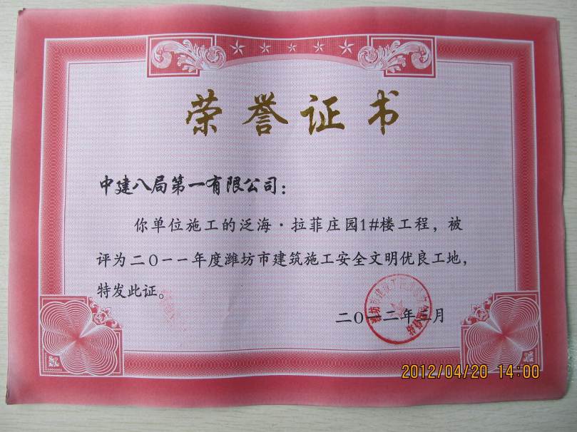 近日,濰坊‘泛海.拉菲莊園1#-5#樓’工程,經濰坊市建筑工程質量安全監督站檢查評定,并通過網上公示后,榮獲2011年度濰坊市建筑施工“安全文明優良工地”。