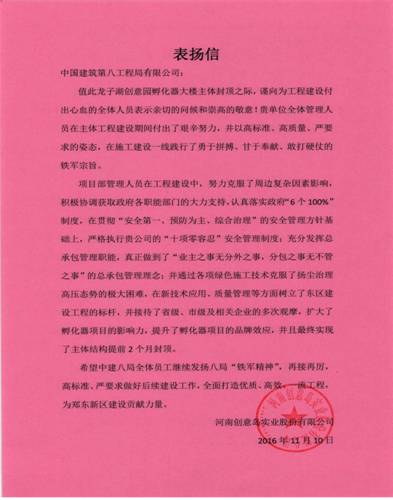 封頂儀式由河南分公司經理何偉主持,各單位代表參加,河南省省委宣傳部副部長、河南日報報業集團黨委書記、董事長、社長趙鐵軍宣布:龍子湖創意園孵化器大樓工程,金頂落成!公司副總經理寧文忠代表我方感謝各單位的支持,并做出莊嚴承諾,爭取早日交給業主一個滿意、優質、放心的好房子。業主單位負責人程勇當場宣讀表揚信:感謝八局全力以赴抓質量,保安全,促生產,勇于拼搏,甘于奉獻,真正做到了“業主之事無分外之事,分包之事無不管之事”的總承包管理理念。希望我們繼續發揚八局“鐵軍精神”,再接再厲,高標準、嚴要求做好后續建設工作,全面打造優質、高效、一流工程,為鄭東新區建設貢獻力量。此次工程的提前封頂也激發了項目全體人員敢打必贏的工作豪情,增強了大家圓滿完成孵化器項目,努力向公司交一份滿意答卷的信心。