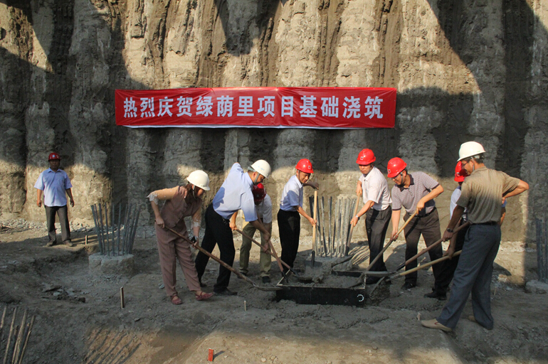 6月30日5時16分,在天津魯能綠蔭里項目施工現場,天津魯能置業有限公司總經理黃先可,副總經理郭廣森,北京分公司經理張述堅、總工兼天津魯能綠蔭里項目經理王洪共同拿起鐵鍬為項目墊層澆筑第一批混凝土,標志著魯能綠蔭里項目正式進入地下結構施工階段。
