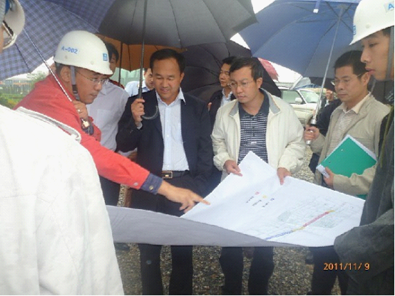 10月9日,佛山市市委常委、常務副市長冼瑞倫攜市、區、鎮等相關單位領導冒雨來到公司廣明高速S03標工地就拆遷、交地工作視察指導。 冼市長在詳細詢問了項目拆遷、施工進度、施工所遇困難等情況后表示:廣明高速項目是廣東省更是佛山市的重點建設項目,市、區各級領導要給予足夠的重視和配合,把廣明高速項目的拆遷工作作為目前重中之重來執行,確保項目順利施工。同時,冼市長還高度贊揚了我公司克服困難,堅持推進的工作作風,并勉勵項目員工要繼續發揚特別能吃苦,特別能戰斗的“鐵軍”精神,將廣明高速項目建設好。