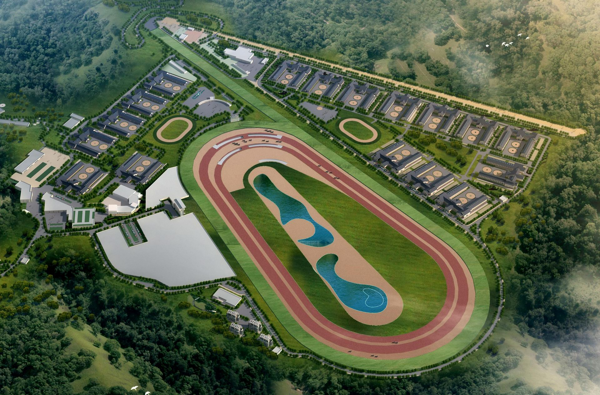 廣州香港馬會馬匹運動訓(xùn)練場總承包工程,房建部分由馬廄、馬匹醫(yī)院等36個單體組成,市政部分主要由T1、T2、T3跑道及6.5km道路組成;園林部分主要為人工湖、室外園林組成。