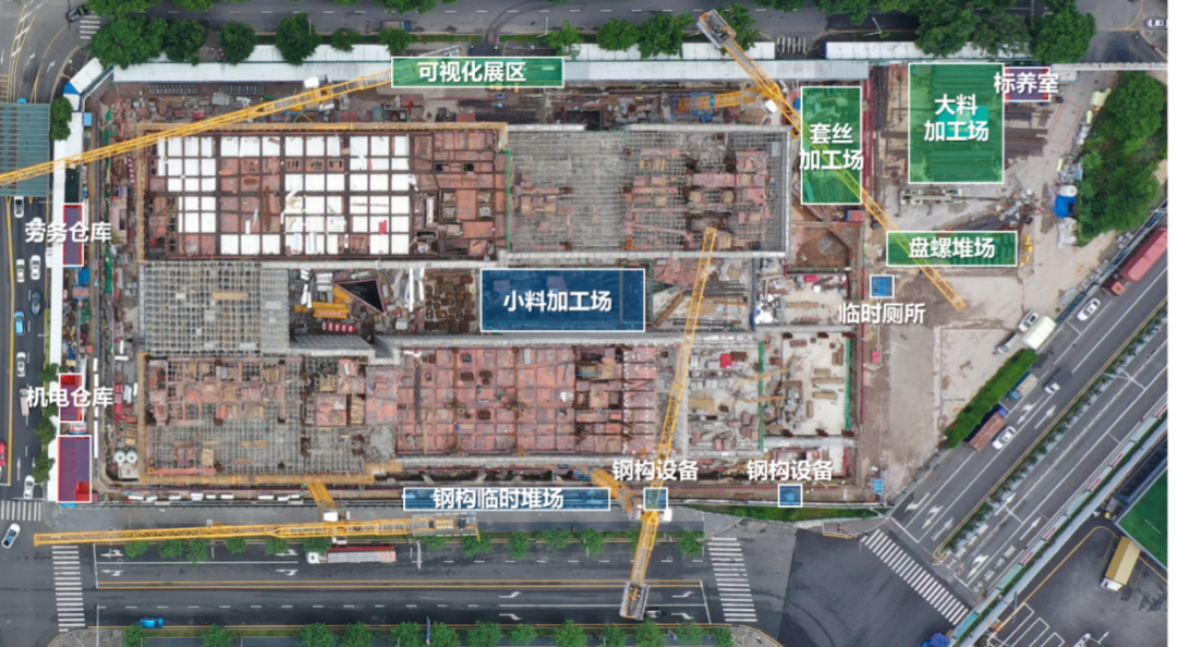 面對場地狹小的問題,項目靈活安排施工部署,優先打通環場道路,及時轉移料場,騰出樁基施工作業面,利用裙樓屋面作為外架、幕墻材料堆場實現“7天一層”的主體結構工期。