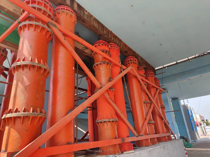 在項目施工過程中,需要四跨現澆梁同步頂升,頂升高度50厘米、重達2060噸。項目團隊采用橋梁整體頂升技術,每個液壓千斤頂配備一個位移傳感器,實時監測、控制橋梁頂升的位移和姿態,使同步頂升的精度精確到1毫米,實現千噸重橋梁“拔地而起”。
