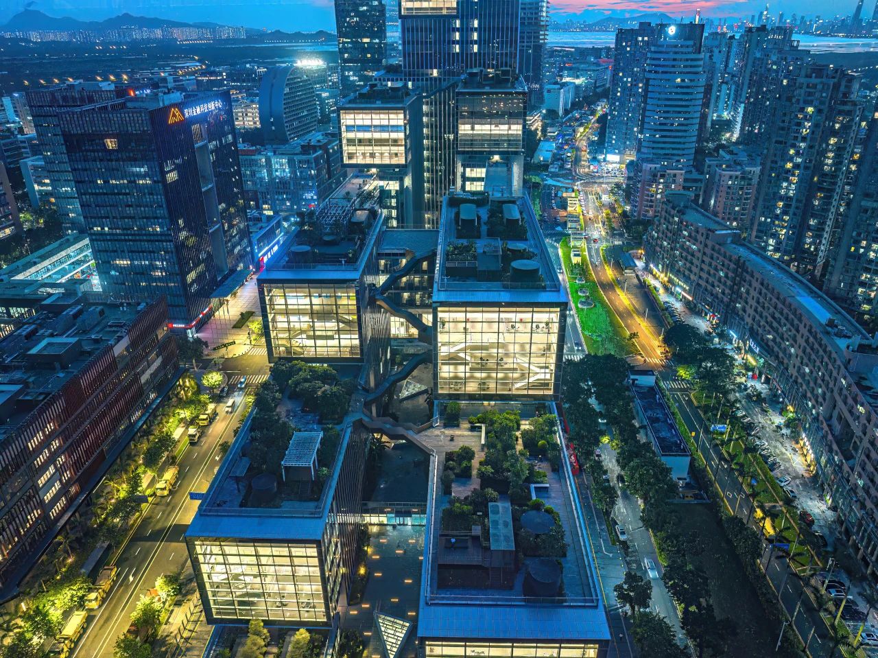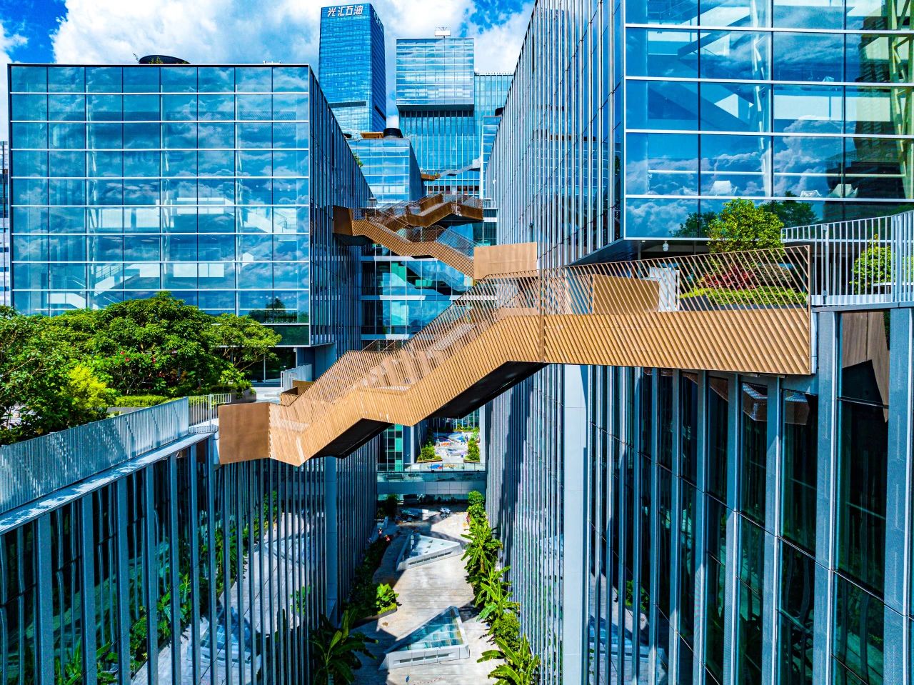 項目創新布局“階梯式獨棟實驗室”,沿深圳河一側錯落分布著8個不同主題的屋頂花園,為科研人員在工作之余營造了碰撞科創思維、舒適放松的“屋頂上的科學家樂園”。每個獨棟實驗室頂部均配有室內交流共享空間——“探索之眼”,大面積采用玻璃幕墻,在提供廣闊視野的同時,為科研人員提供思想交流的空間。