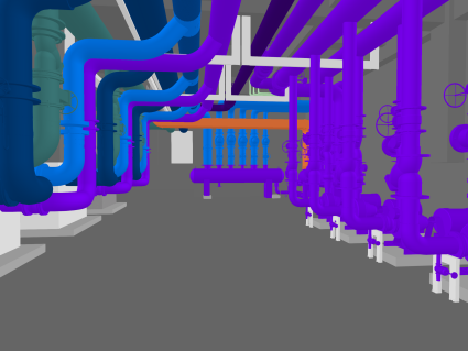 項目地下車庫車道區域管線復雜,對管線標高要求嚴格。項目采取綜合支架排布,減少管線碰撞,提高車道凈高,同時根據現場施工進度,對制冷機房、消防泵房等重要功能性房間,結合BIM技術應用,對機房、泵房綜合管線進行排布優化,使得機房內部維修方便、整齊美觀。