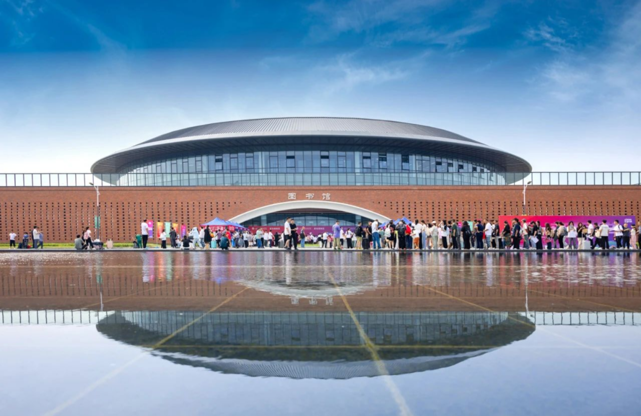項目圖書館造型參考客家土樓,總建筑面積9433平方米,圓環形屋蓋內徑達45米,采用開放式現代布局,大面積開窗引入自然光,設置智能書架、智能導覽系統營造舒適便捷的閱讀空間。