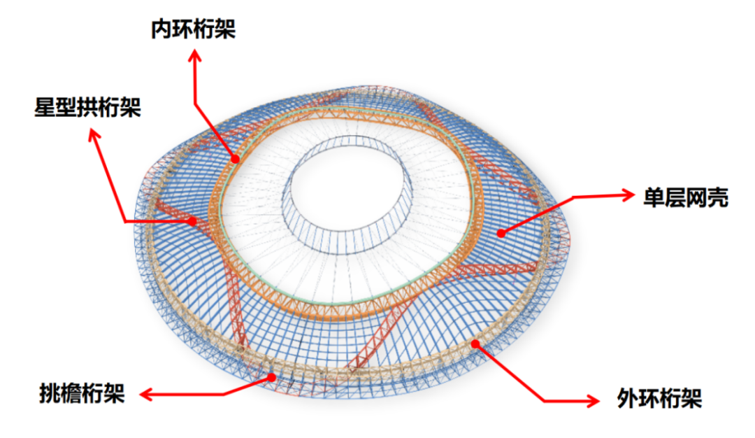 項目屋蓋結構由鋼結構、索膜結構和金屬屋面組成,鋼結構由內、外環桁架、星型拱桁架挑檐桁架等88榀桁架以及單層網殼組成,單榀鋼桁架重約200噸,需要在60米高空完成拼裝焊接,外輪廓平面近似直徑280米的正圓,中心開口平面為長軸176.5米、短軸156.5米的橢圓。
