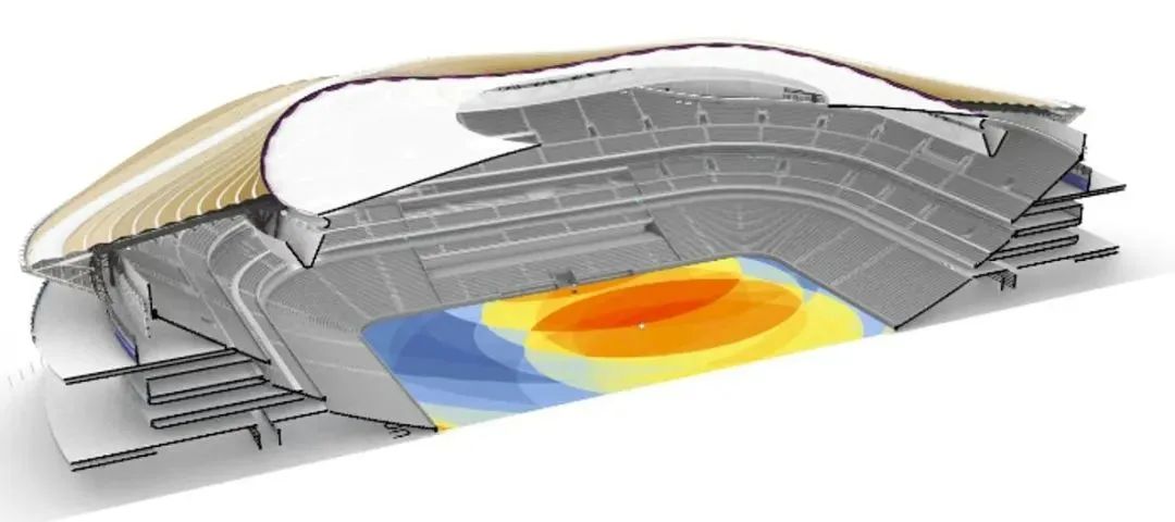 屋蓋鋼結構內側的索、膜結構由CFRP-鋼索組合索桁架和大面積單層PTFE覆膜構成,是國內首例在專業足球場大規模應用高透光率PTFE網格膜材料,創新融合了大懸挑屋蓋剛性體系異性索膜柔性體系等諸多大跨空間結構元素,是目前國內施工最為復雜的專業足球場之一,在兼顧功能、美觀與采光性能的同時,具有“剛柔并濟”結構受力特征。