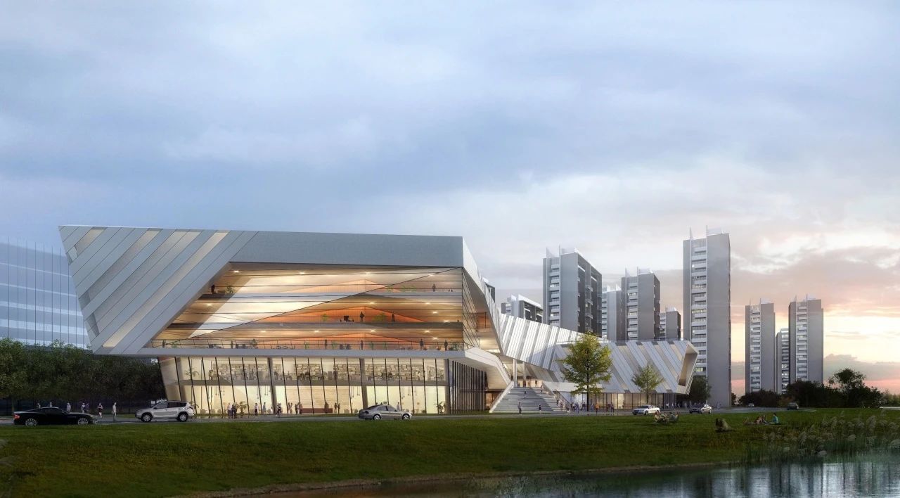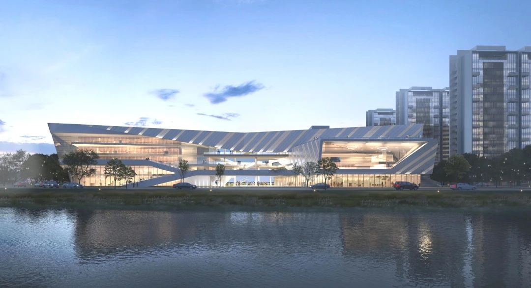 項(xiàng)目以“建筑與人、景觀藝術(shù)、城市對話”為核心理念,采用大面積轉(zhuǎn)角玻璃幕墻和鋁板墻面,形成復(fù)雜造型與外立面條狀紋理,與濱水景觀相呼應(yīng),打造極具未來感的建筑形態(tài)。
