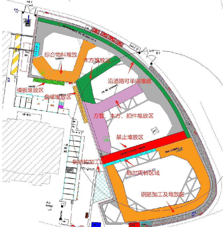 項目基坑面積5500平方米,占項目總場地面積的91%,需要“螺螄殼里做道場,方寸之間做騰挪”,項目對場區進行科學布置,分類分區分專業規劃材料堆場,細化料場管理責任單位及責任人,動態調整物資進場情況,確?!半S用隨進、適時生產”。