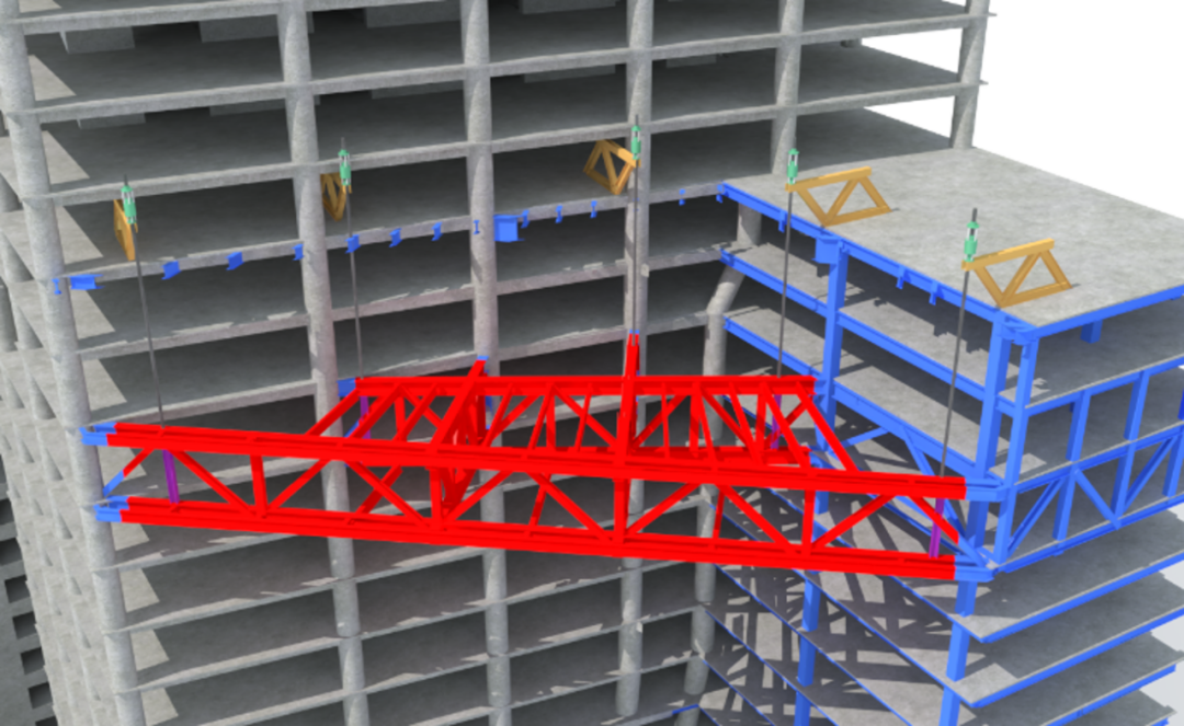 為保證鋼連廊平穩提升,項目團隊基于BIM技術對鋼結構進行提前深化,結合模型模擬提升全過程分析所有鋼構件安裝順序,從而保證安裝過程中的結構應力強度與結構穩定性,滿足設計要求,最終歷經9個小時作業將320噸鋼結構提升近70米。