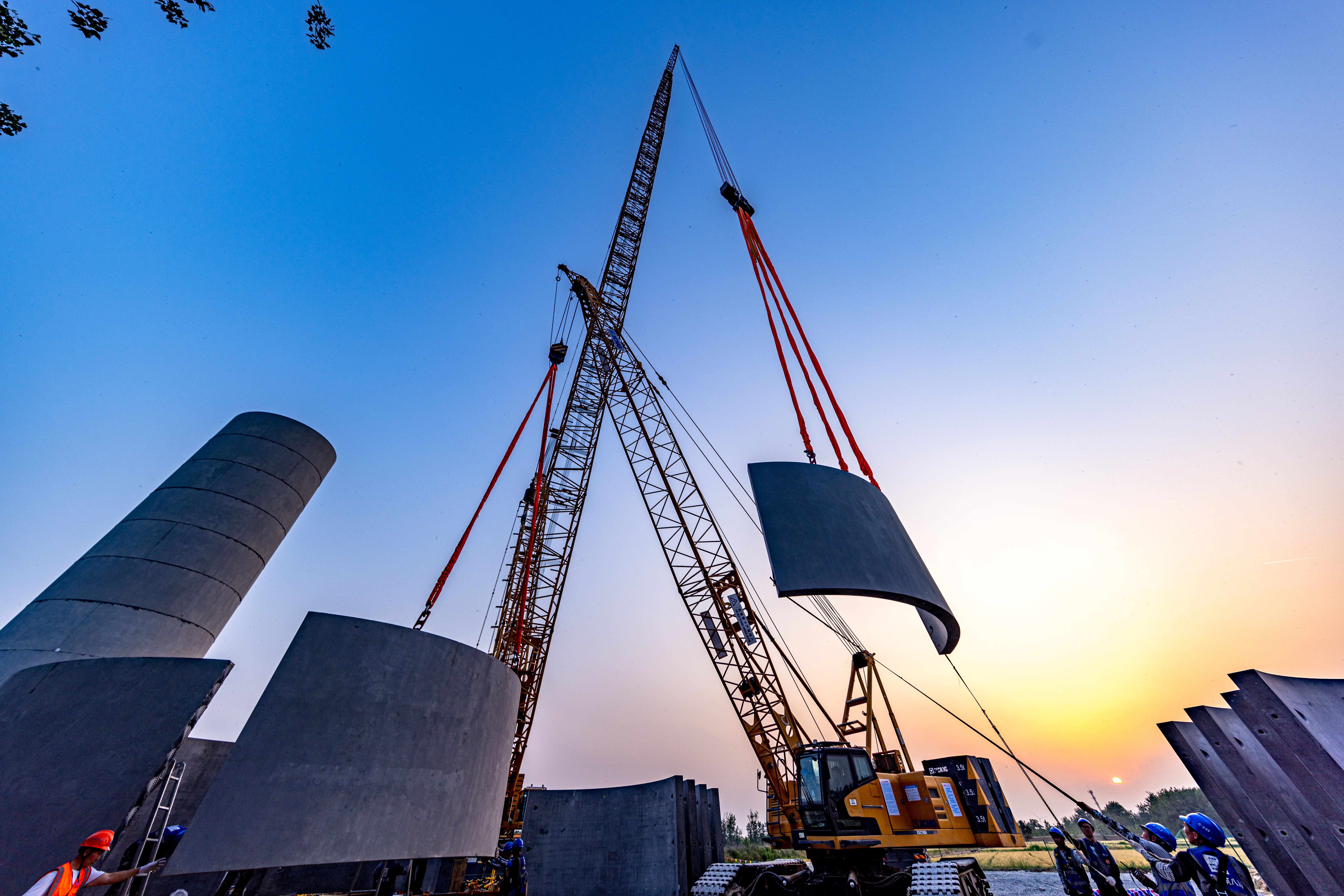 此次吊裝的風機高185米,采用“主吊+副主吊”吊裝方式,實現46節混塔與2節鋼塔高強螺栓連接,127噸機艙、直徑220米葉輪升空固定。項目團隊高度重視前期策劃,提前32天完成7個鄉鎮、20個行政村協調工作,采用“一機一案”的施工方式,克服大件運輸、大型設備吊裝危大工程管控等難點。“吊裝小組”使用智能化風速儀、無人機、360°攝像頭等實時監測,護航吊裝全過程,順利完成首臺風機百米吊裝。