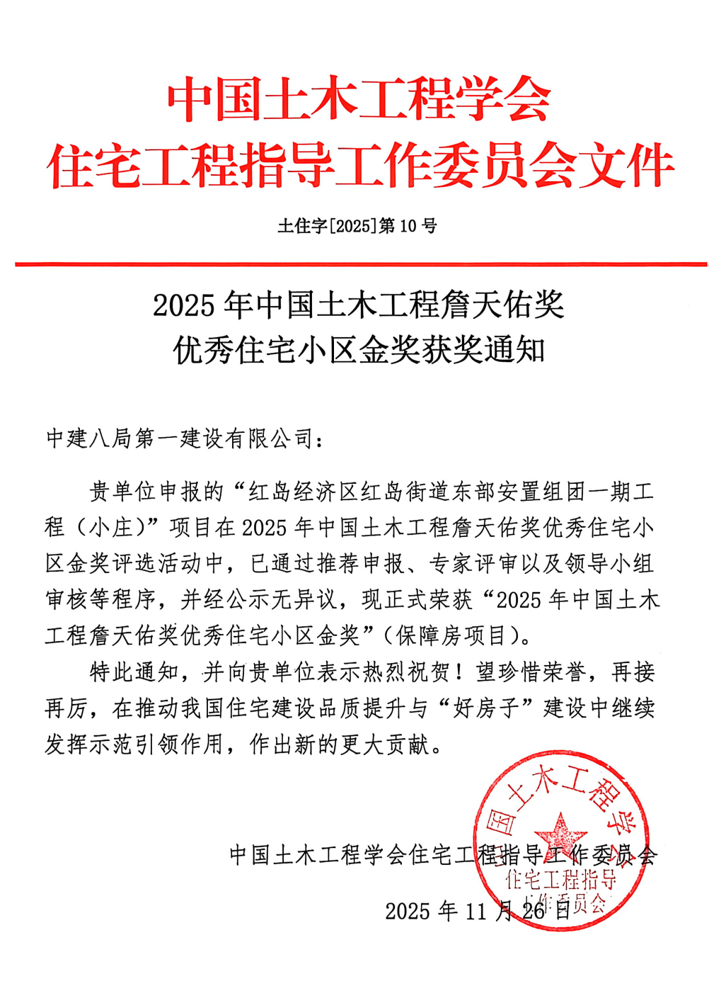 近日,2025 年中國土木工程詹天佑獎優秀住宅小區金獎名單公布,中建八一承建的紅島安置房東部組團項目小莊地塊入選,目前公司已累計獲得 14 項詹天佑獎優秀住宅小區金獎,彰顯 “八一建造” 的匠心品質。