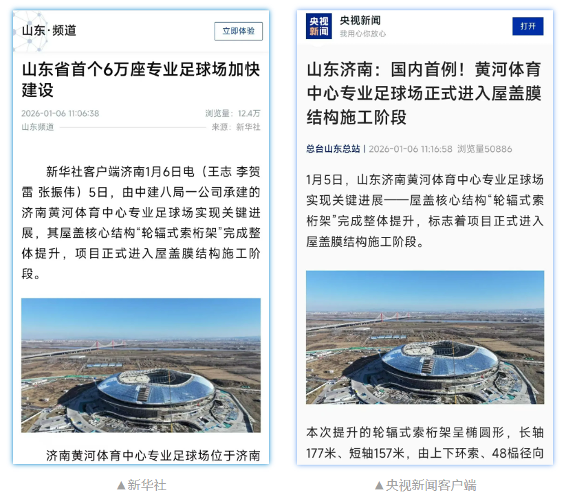 近日,中建八局一公司承建的山東省首個 6 萬座專業足球場——黃河體育中心專業足球場項目完成輪輻式索桁架體系吊裝,正式進入屋蓋膜結構施工階段,受到新華社、央視新聞等主流媒體報道。