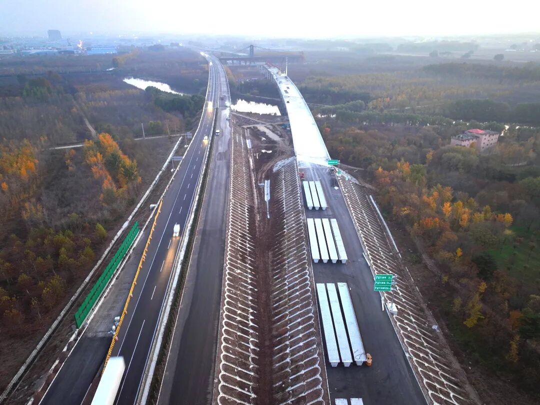 項目途經全線唯一特大橋 —— 跨膠濟鐵路特大橋,由于原橋梁部分橫跨植被和河流,原定的雙側拼寬施工方案空間受限,施工難度大且工程進展緩慢,項目因地制宜采用 “單側分離新建” 方案,從兩側各加兩車道變為一側新增四車道,在大橋北端進行 “路基改橋” 作業。