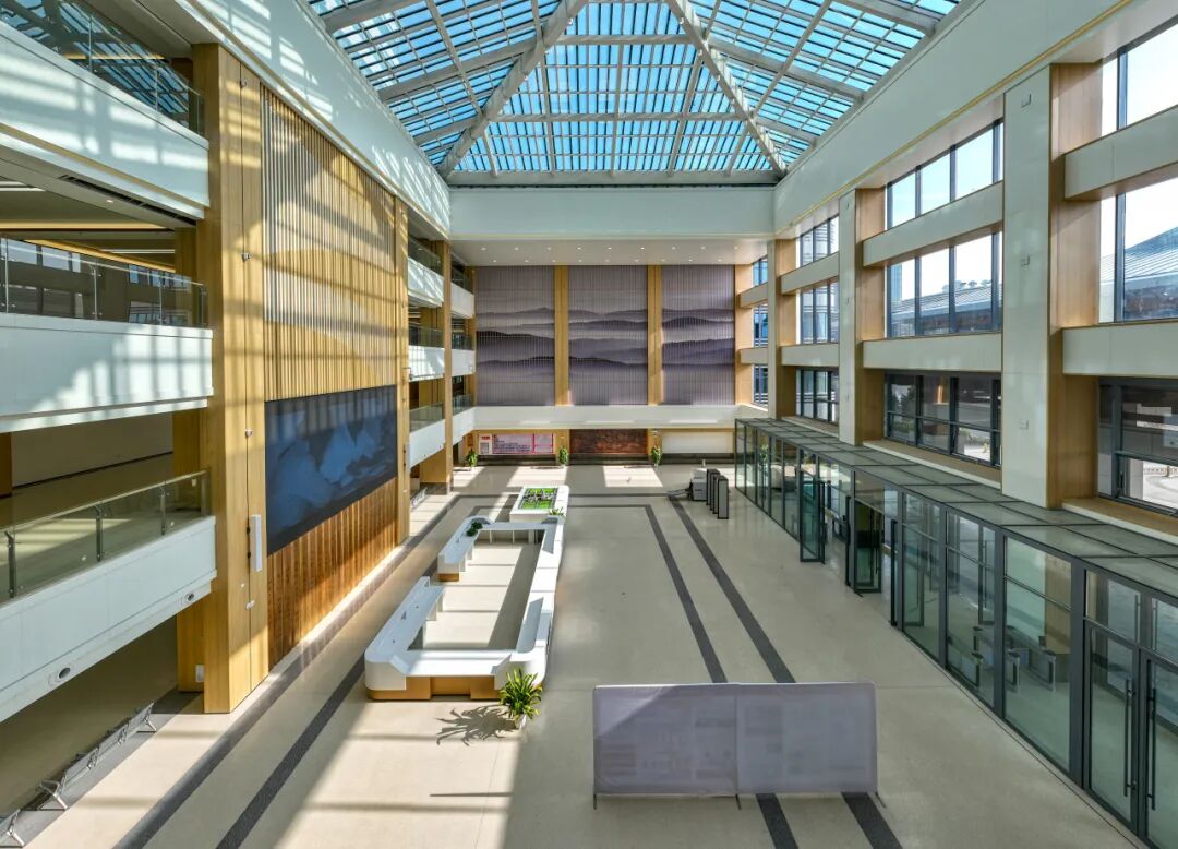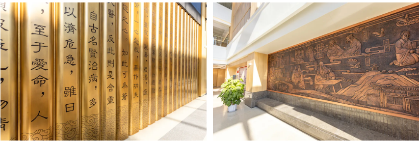 項(xiàng)目設(shè)計(jì)理念充分融合中醫(yī)文化,建筑整體中間低、兩側(cè)高,形成峰巒環(huán)抱、藏風(fēng)聚氣的格局,裝飾采用傳統(tǒng)窗格與門樓造型,內(nèi)部建設(shè) “中醫(yī)文化長廊”、中醫(yī)主題浮雕,營造寧心、靜氣、安神的診療空間。門診大廳設(shè)置整體凸面玻璃采光井,外部搭配鋁板格柵造型,在保證結(jié)構(gòu)強(qiáng)度、調(diào)節(jié)光影層次的同時,最大限度引入自然光線,打造明亮、通透、典雅的就診環(huán)境。