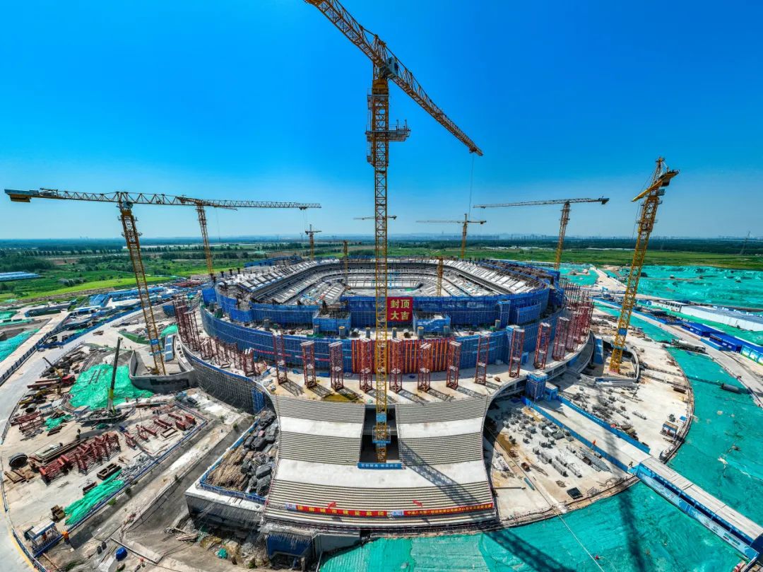 7月7日,濟南黃河體育中心專業足球場項目建設現場塔吊林立、機械轟鳴、熱潮涌動,經過中建八局一公司建設者們371天的晝夜奮戰,項目主體結構順利封頂,標志著山東省首個6萬座專業足球場全面邁入屋蓋鋼結構施工新階段。