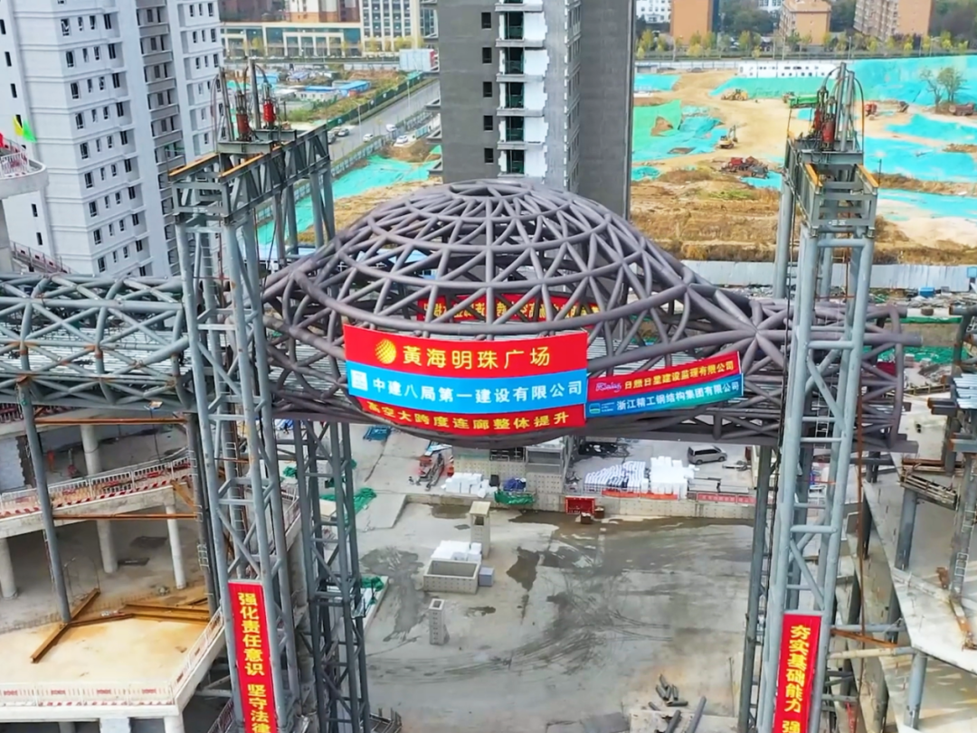 11月25日,日照黃海明珠廣場項目高空超大類球體鋼結構連廊合龍,成為日照市目前跨度最大、整體提升重量最大、高度最高的鋼結構連廊球形結構工程,其成套施工技術達國際領先水平。