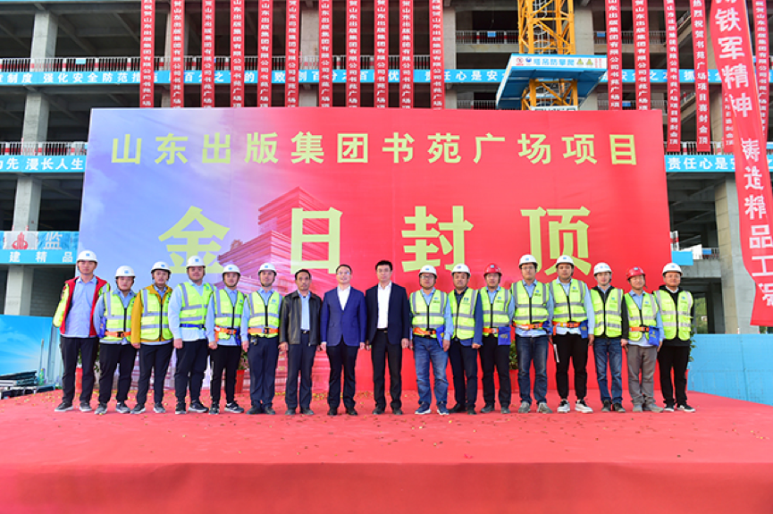 10月14日,一公司山東出版集團圖書展示樓項目喜迎封頂。 山東新源文化置業(yè)有限公司董事長李濤、總經(jīng)理孫明,濟南建設監(jiān)理有限公司董事長林峯,山東意匠建筑設計有限公司副院長劉祥春,一公司黨委書記、董事長董文祥,濟南公司總經(jīng)理霍文濤共同出席了封頂儀式。
