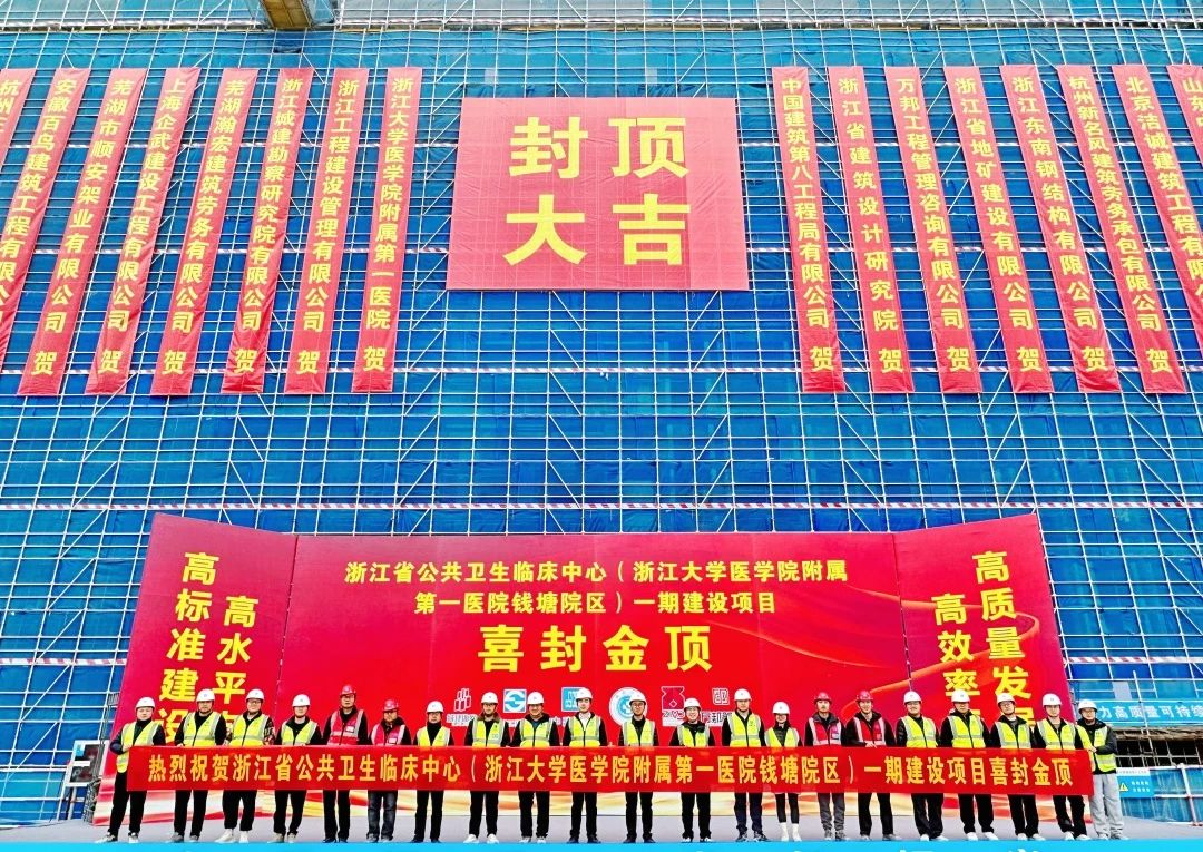 近日,中建八局承建的浙江省“十大工程”重點任務,浙江大學醫學院附屬第一醫院錢塘院區項目(一期)順利封頂,正式進入裝飾裝修階段。
