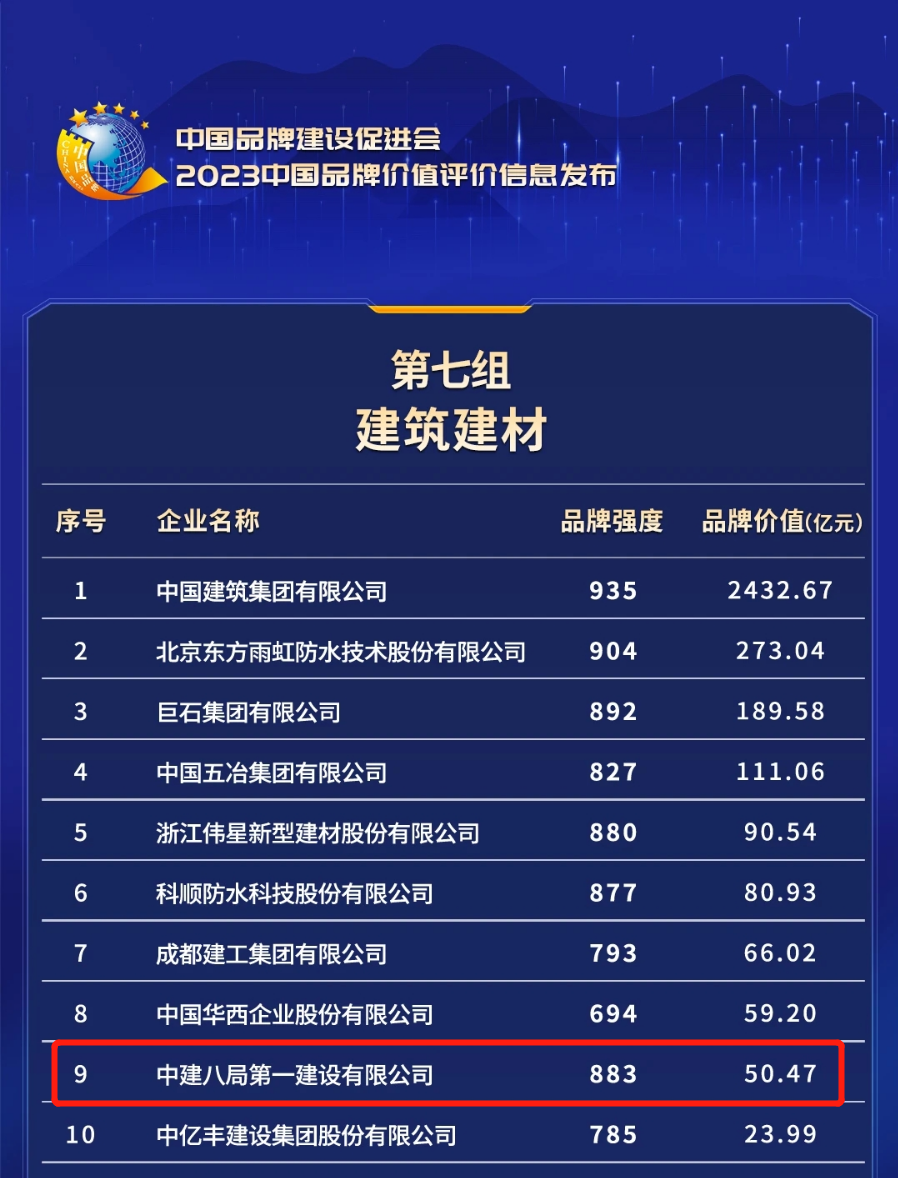 近日,在2023年中國品牌日活動期間,新華社、浙江省人民政府、中國品牌建設促進會、中國資產(chǎn)評估協(xié)會等單位聯(lián)合發(fā)布了“2023年中國品牌價值評價信息”。中建八局一公司以品牌強度883、品牌價值50.47億元位列建筑建材行業(yè)第9位。