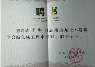 2017年9月25日,山東土木建筑學會施工專業委員會第九屆會員代表大會在濟召開,會議選舉產生了第九屆全委會,公司當選主任委員單位,總工程師于科被聘為山東土木建筑學會綠色施工評審專家。