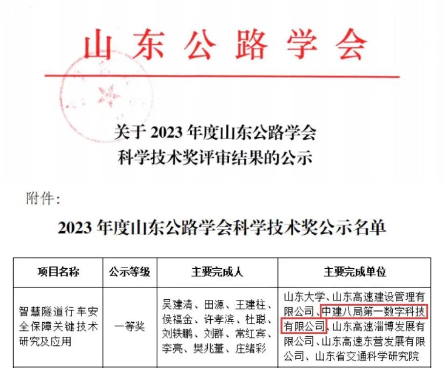 近日,2023年度山東公路學會科學技術獎完成評審結果公示,中建八局第一數字科技有限公司參與的”智慧隧道行車安全保障關鍵技術研究與應用”科技創新項目獲評山東公路學會科學技術獎一等獎。