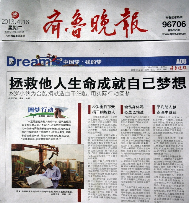 “我很榮幸,也很驕傲!能夠有機會用我的造血干細胞去拯救一名臺灣白血病患者的生命!我夢想每個白血病患者都找到合適的骨髓配型!”4月14日下午,在山東博物館舉辦的主題為“中國夢的回顧與展望”“齊魯大講壇”上,作為第一次獲邀在大講壇上發言的普通群眾代表、山東省首例向臺灣捐獻造血干細胞的志愿者、來自中建八局一公司安裝分公司的何嘯的一席話,引來現場聽眾的熱烈掌聲。