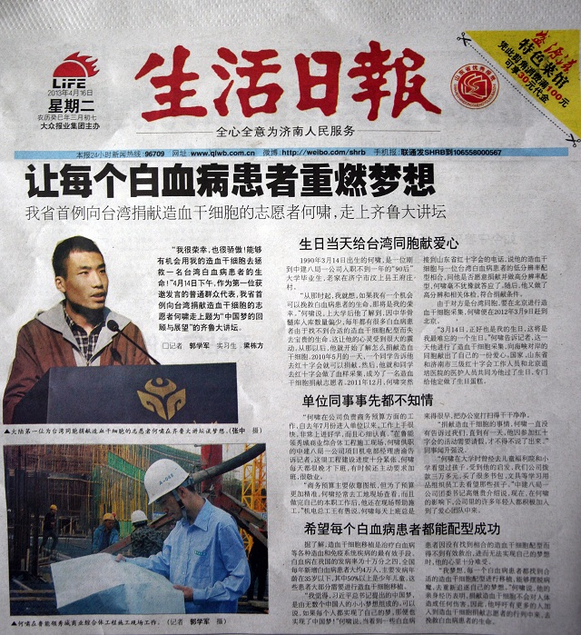 近日,一公司員工何嘯成為第一次獲邀在齊魯大講壇發言的普通群眾,講述了自己捐獻骨髓救助臺灣同胞的事跡,引起了現場觀眾的熱烈掌聲。何嘯的事跡也引起了齊魯晚報、山東生活日報等大媒體的關注。近日,兩大媒體記者趕赴一公司進行采訪,并于16號的報紙中大篇幅報道了何嘯的事跡。