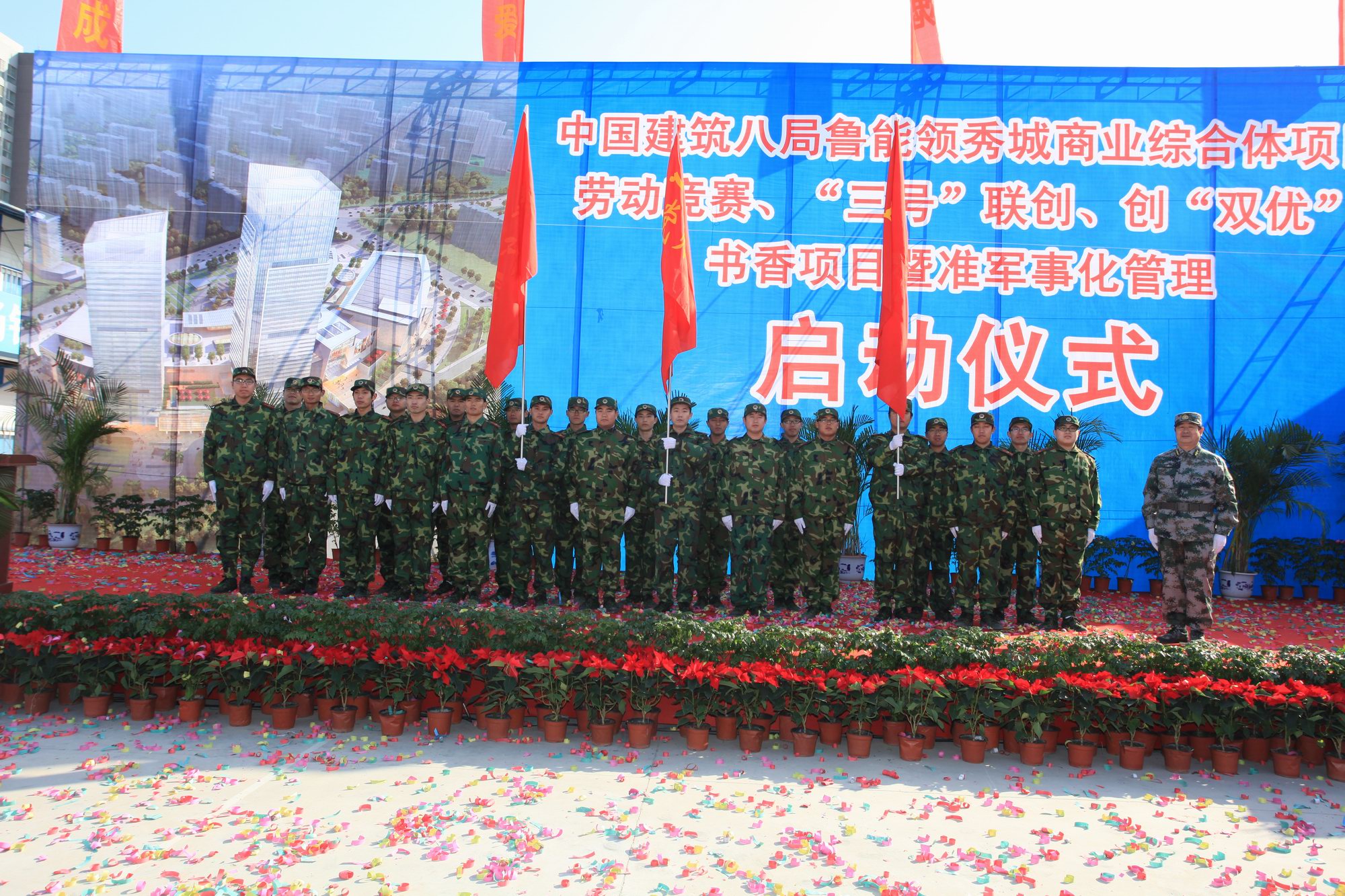儀式上,與會領導分別為項目黨員先鋒號、工人先鋒號、青年文明號授旗,并為書香項目、準軍事化試點工程及創“雙優”重點項目揭牌;項目管理人員進行了準軍事化管理成果匯演,并集體宣誓,表明干好工程的決心。一公司紀委書記薛樹海與項目經理簽訂了廉政協議。