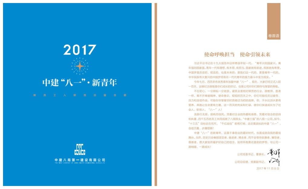 為了讓每位新員工在每一個人生階段都留下成長印記,公司特地制作了《“八一”新青年紀念畫冊》,收錄了全體2017新員工的個人簡介、成長心得、未來愿景以及導師寄語,并由一公司領導為新員工代表頒發新青年紀念畫冊。
