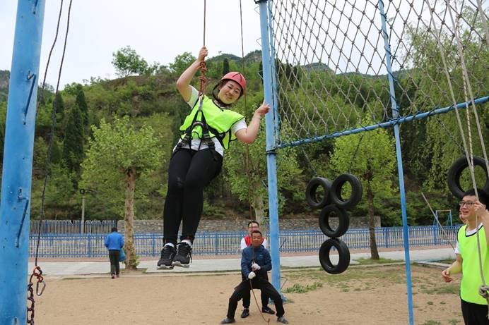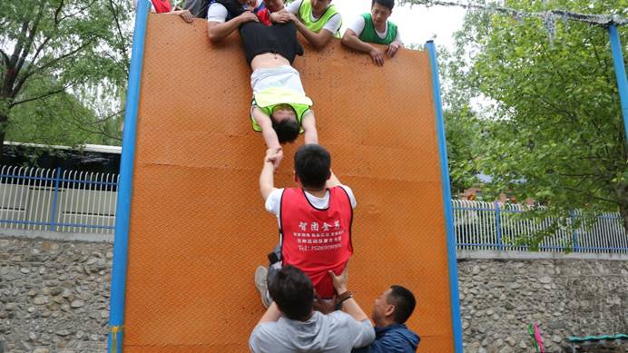 在培訓講師的帶領下,大家穿上紅、黃、綠、藍四色馬甲,劃分為四組。在選隊長、隊秘、起隊名、隊歌、口號中,拉近了彼此的距離也加深了彼此的熟悉。“高空斷橋”是一個勇敢者的游戲,更是一個團結協作的游戲,青年們克服內心的恐懼,突破自我極限,勇敢走上“高空斷橋”,地面上的小伙們也在團結協作,拉住繩索,為高空中行走的人保持穩定的環境,在大家的努力下,“恐高癥”患者也成功走過高空斷橋,完美完成任務。在令人恐懼的指壓板環節,大家密切配合,在疼痛中奔跑,不斷刷新通過記錄。在活動最后,也是最為艱難、最為感動的翻越“畢業墻”環節,40名青年要翻越一面高4.2米的光滑墻面,在此過程中,大家不能借助任何外界的工具,所能用的資源只有每個人的身體。“八一”青年通過搭人梯的方法,發揮各自優勢,身體強壯的自愿擔任底座,力量大的在墻上拉人,通過上下密切協作,不拋棄、不放棄,拼盡全力,最終只用了15分鐘完成全部翻越任務,受到了講師的一致好評,青年們也在配合挑戰中感受到了團隊的力量、為彼此的信任和幫助而感動。