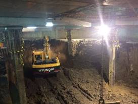 逆做法躍層開挖技術(shù):加大單次開挖深度,一次開挖出兩層結(jié)構(gòu)施工空間,使其中一層結(jié)構(gòu)的施工不占用關(guān)鍵線路。本工程B2、B3層采用躍層開挖技術(shù),將B2層樓板的澆筑從關(guān)鍵路線移除,有效節(jié)省工期約52天。